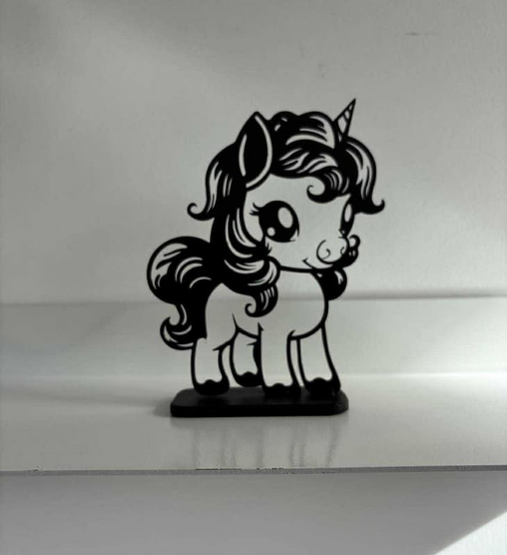 Petite statuette en acier peint  en noir mat,   d’une licorne découpé finement  au laser .